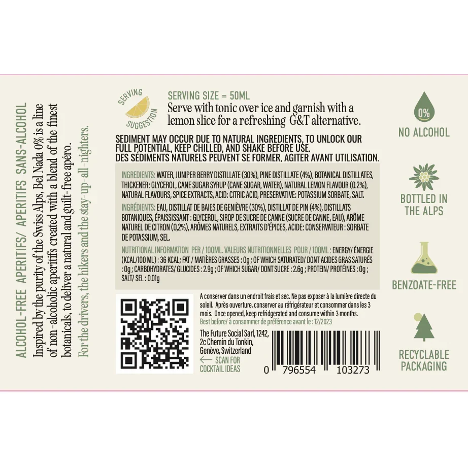 Élaboré avec une attention méticuleuse aux propriétés uniques de chaque arôme, notre gin sans alcool capture l'essence de la nature suisse à chaque gorgée.