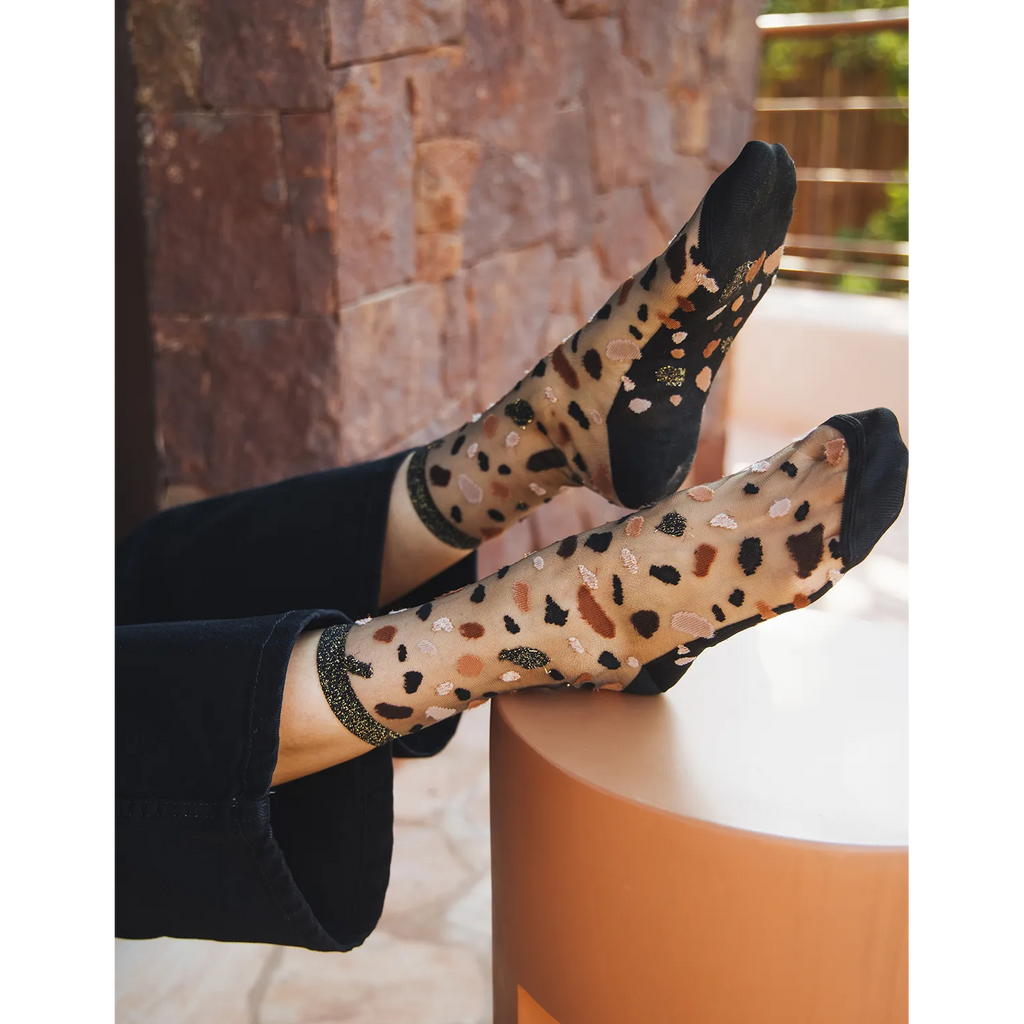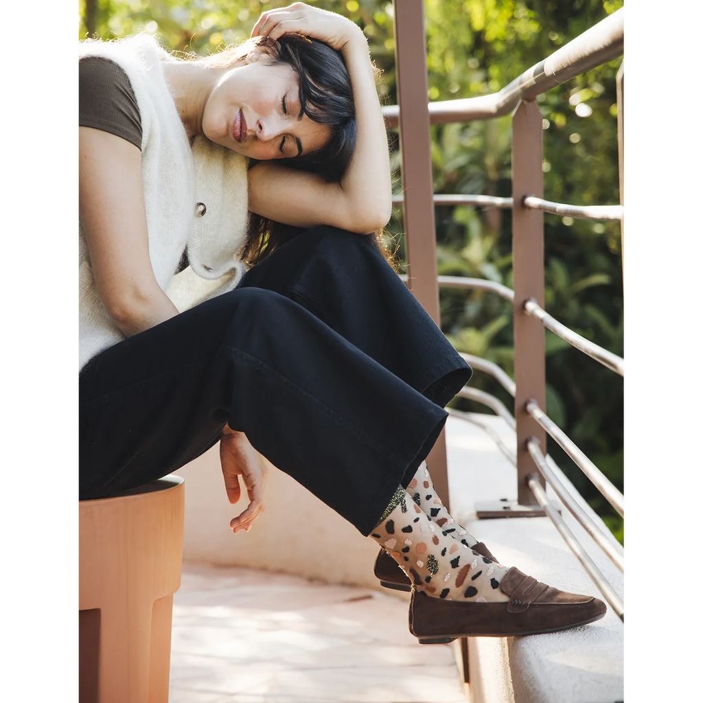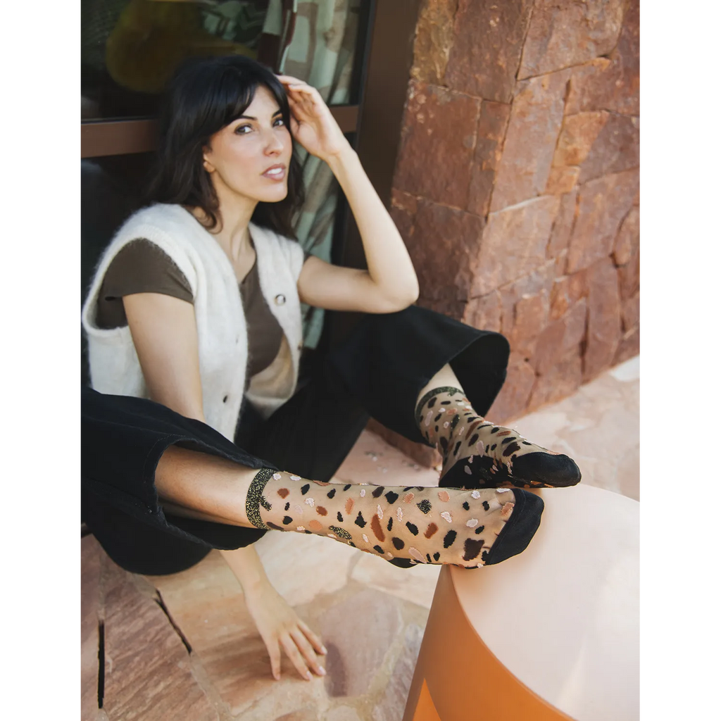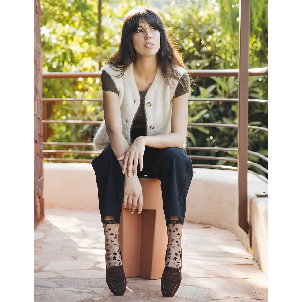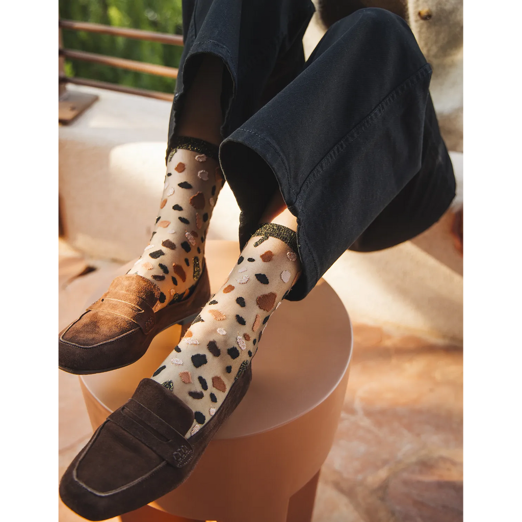 L'une des trois paires réalisées en collaboration avec Reqins. Le modèle brun s'inspire du givre sur un lac en hiver. Ce modèle rehaussera vos tenues avec style. Il est à porter avec un pantalon noir ou un jean brut ou clair. On peut également le porter avec des baskets, des escarpins ou des mocassins.