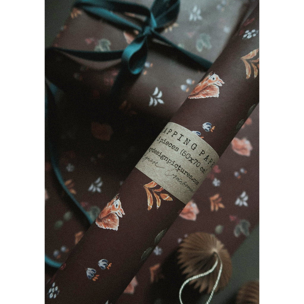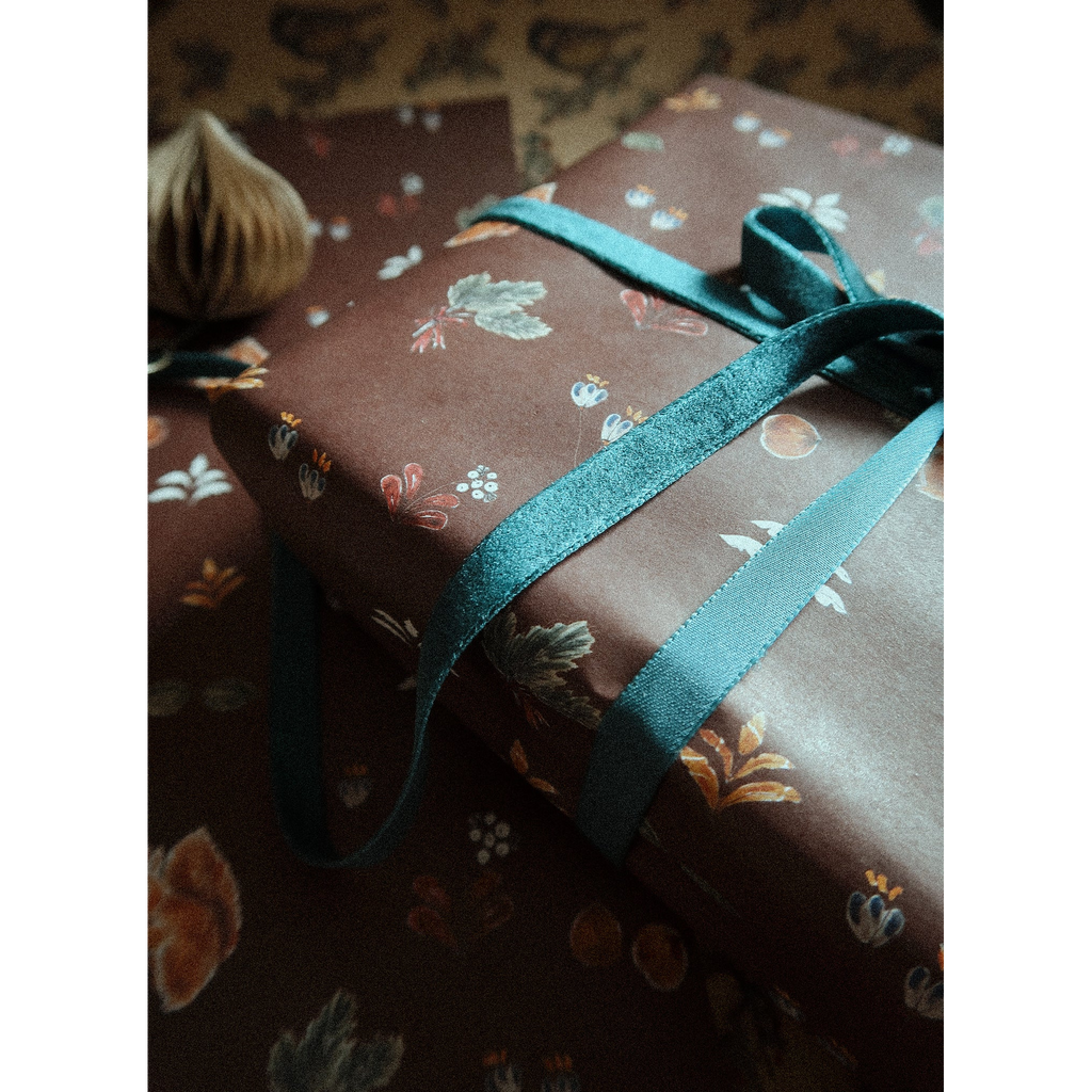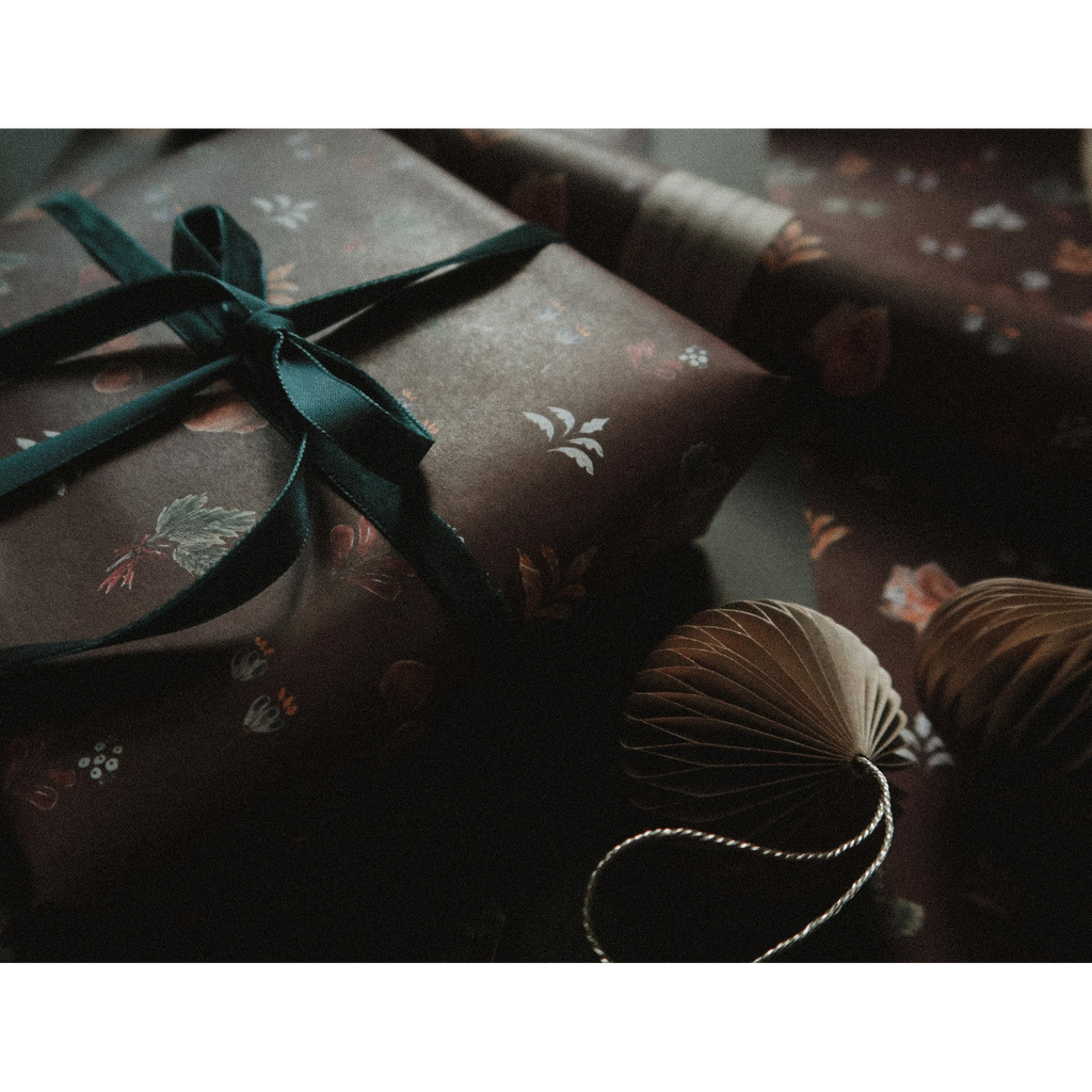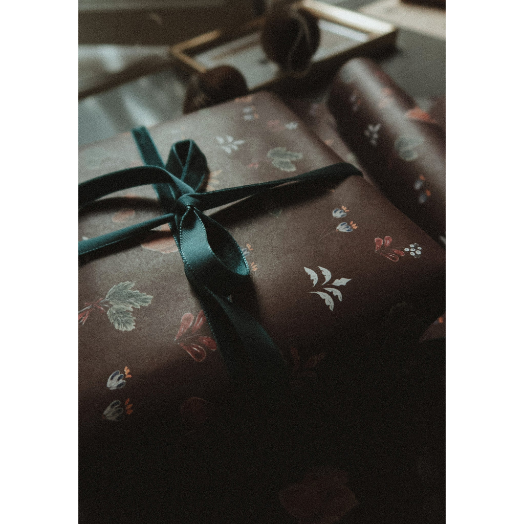 Ce papier cadeau de Noël à motifs floraux et bruns est imprimé sur un papier offset blanc de 75 g/m².