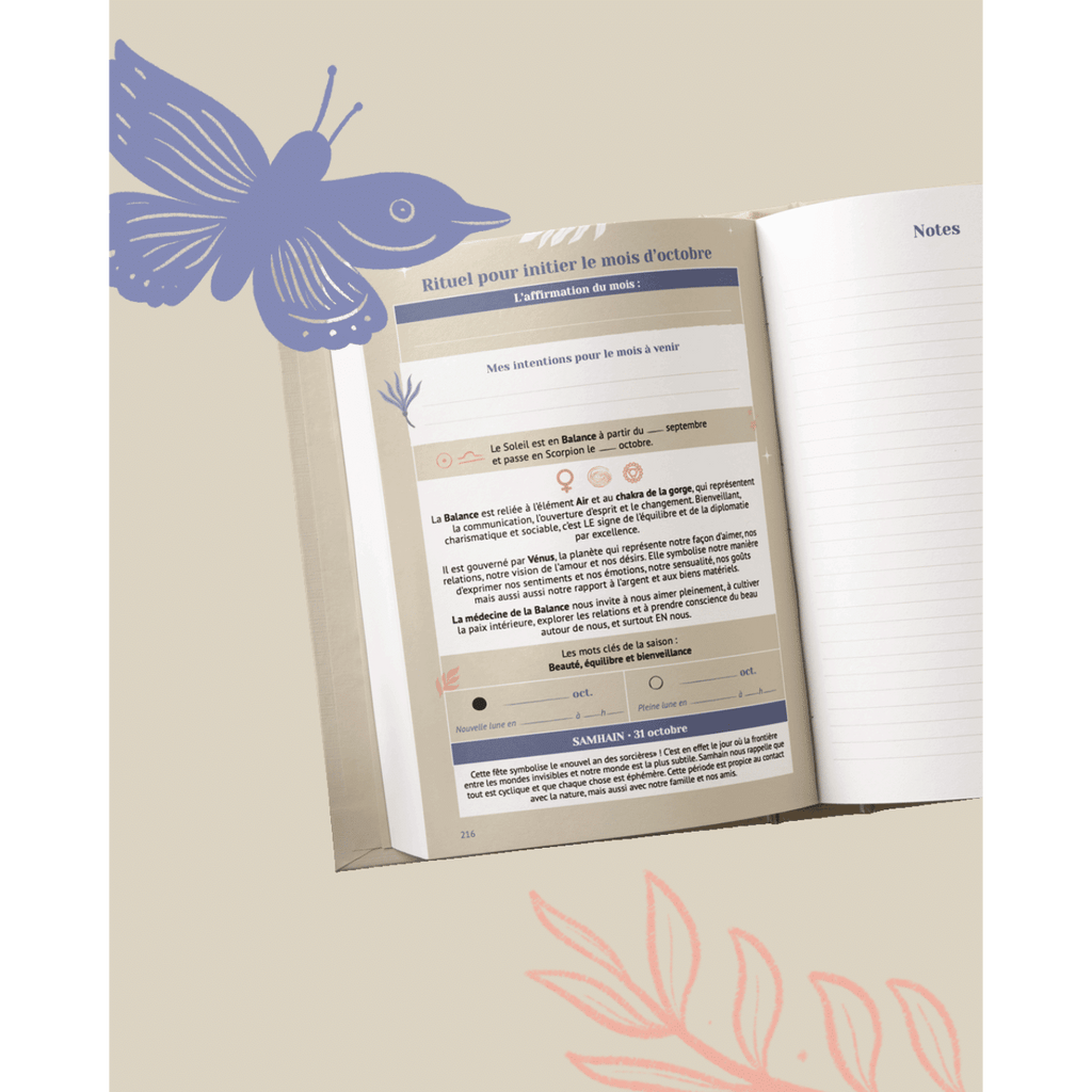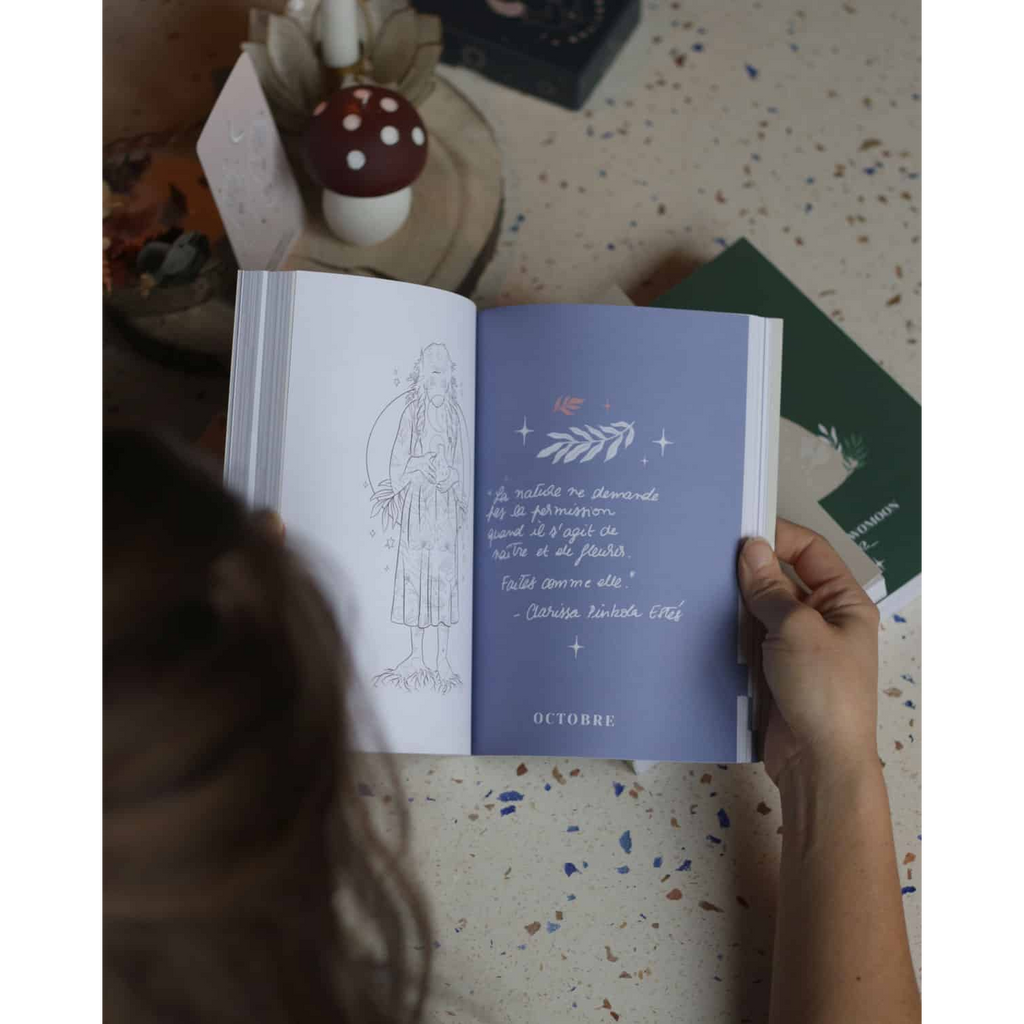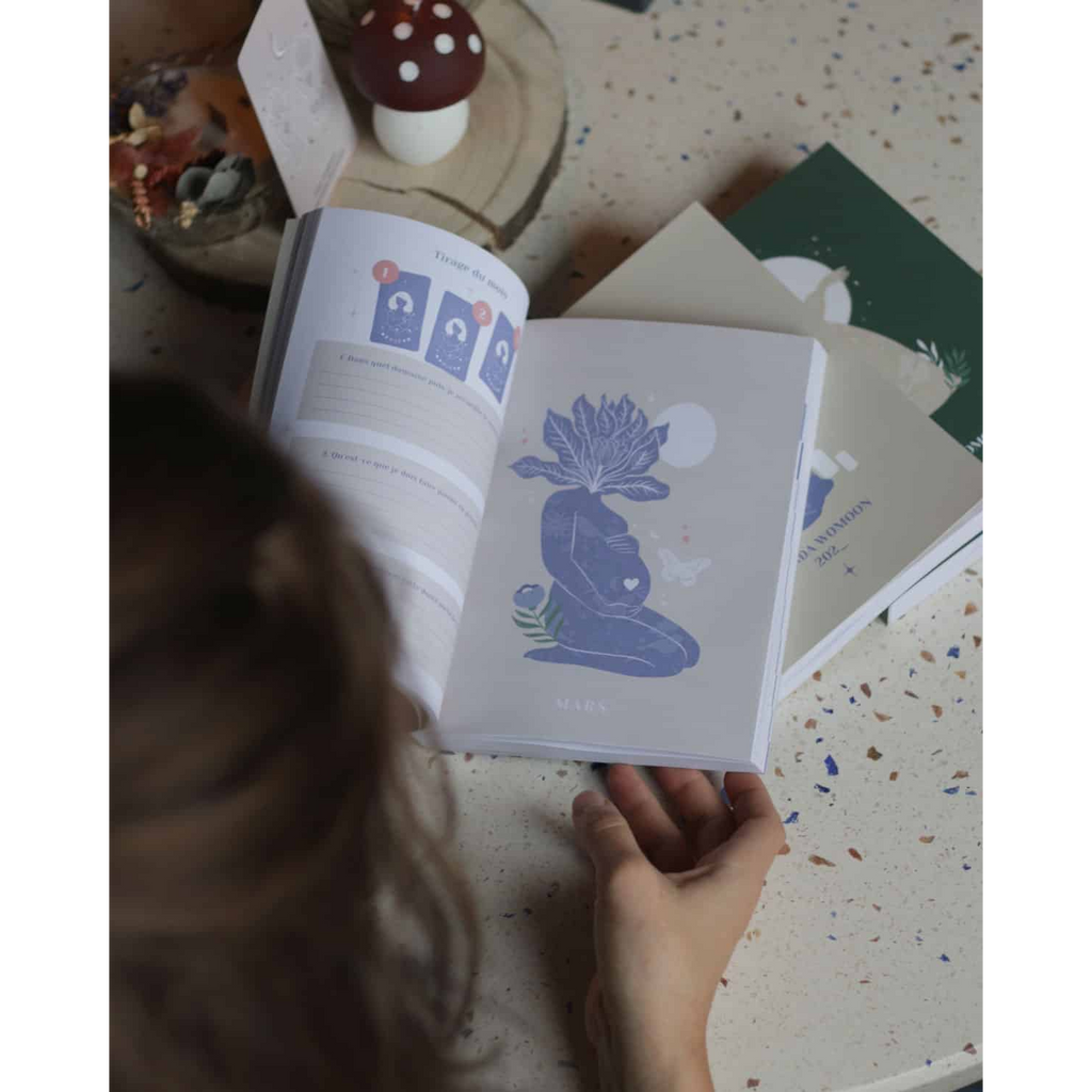 Vous trouverez également dans votre agenda Womoon des pages de notes vierges pour noter vos idées, réflexions et projets. Il y a aussi des explications sur le cycle de la Lune et les 4 éléments astrologiques ainsi que sur les 4 phases du cycle menstruel. Et pour finir : des affirmations positives inspirantes, des idées de tirages d’oracle ou un coloriage à chaque fin de mois, de magnifiques illustrations pensées selon les énergies de la saison astrologique…