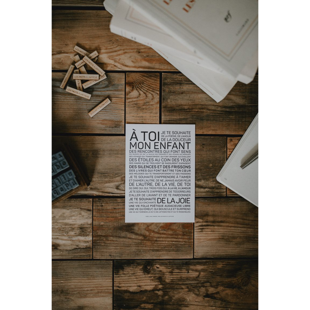 Les premiers mots, les premiers mots à afficher et conserver après une naissance, ceux qu’il, ou elle, conservera comme un cadeau de vie, comme un rappel d’une vie harmonieuse, créative et douce.