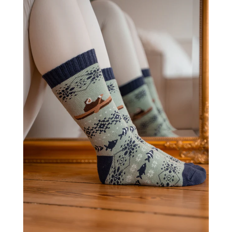 Dans le calme des lacs nordiques, un ours curieux pagaie paisiblement, les yeux fixés sur un banc de poissons scintillant sous la surface. Eskimoer donne vie à une scène d’exploration sereine, baignée de bleu glacé et ornée de motifs traditionnels. Un clin d’œil espiègle aux cœurs sauvages et aux eaux silencieuses.