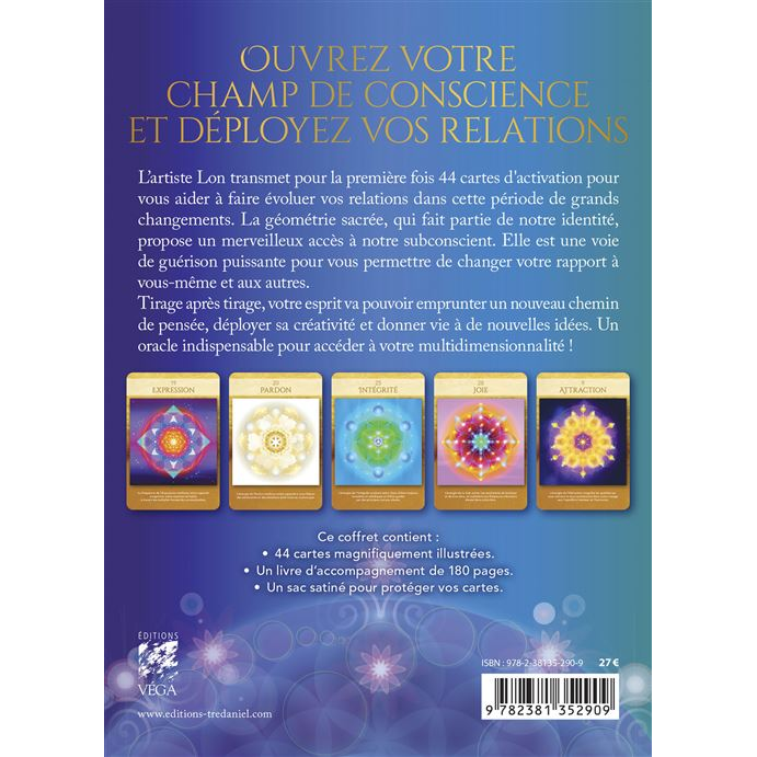L'artiste Lon transmet pour la première fois 44 cartes d'activation pour vous aider à faire évoluer vos relations dans cette période de grands changements. La géométrie sacrée, qui fait partie de notre identité, propose un merveilleux accès à notre subconscient. Elle est une voie de guérison puissante pour vous permettre de changer votre rapport à vous-même et aux autres.