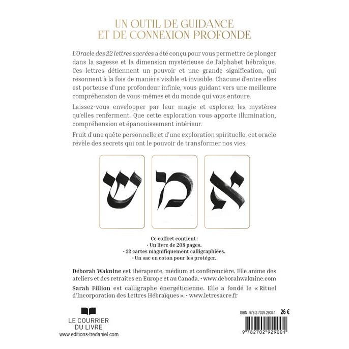 L'Oracle des 22 Lettres sacrées , un outil de guidance et de connexion profonde. Fruit d'une quête personnelle et d'une exploration spirituelle, il révèle les secrets des lettres sacrées hébraïques qui ont le pouvoir de transformer nos vies.