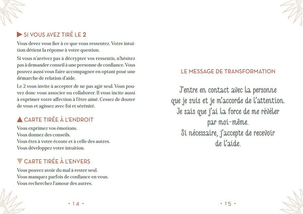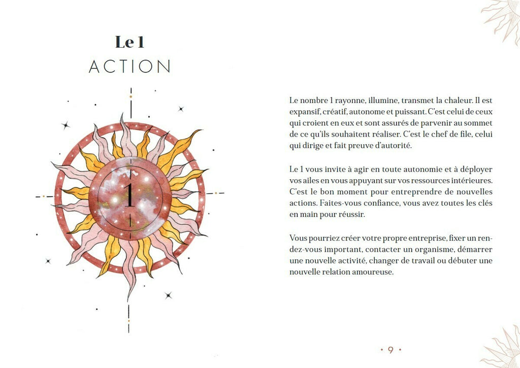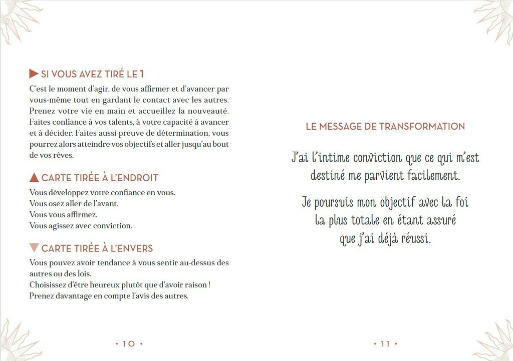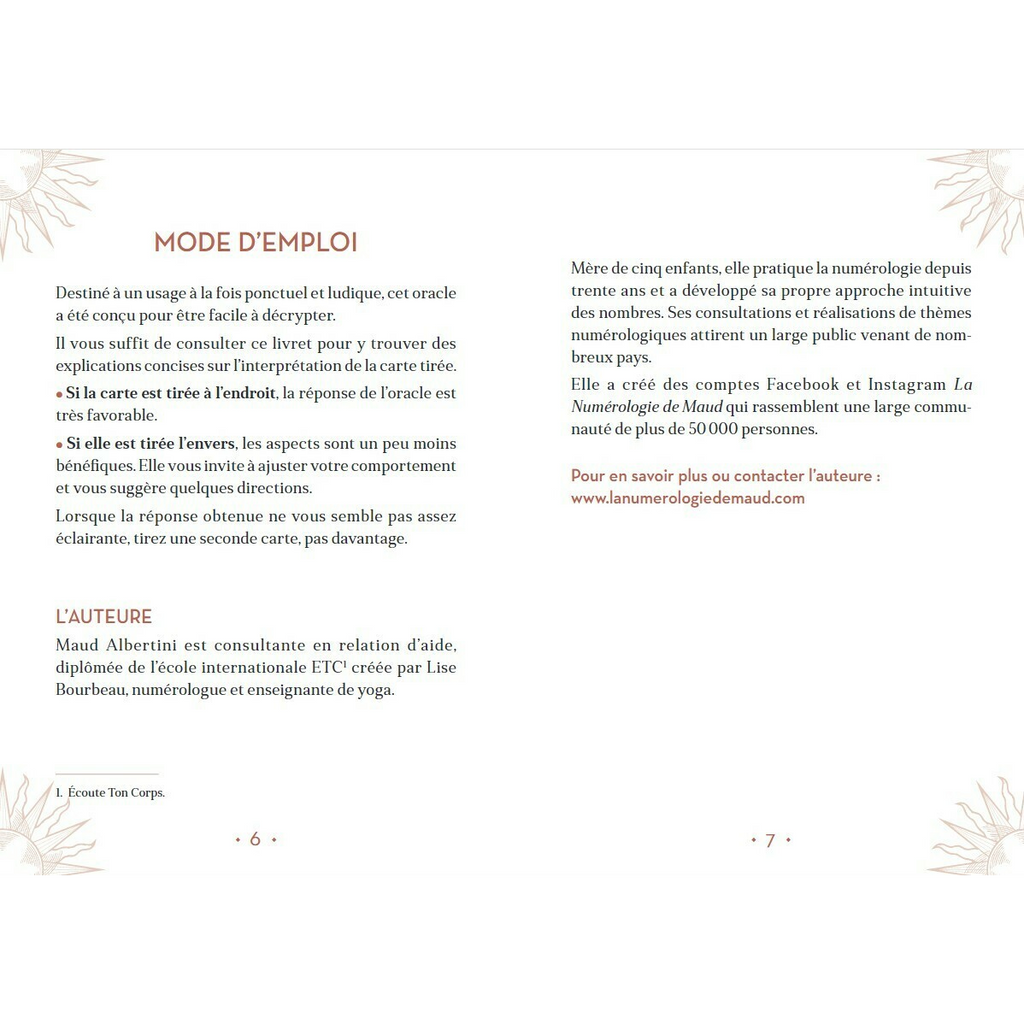 · Un livret explicatif en couleur de 192 pages avec pour chaque carte, le message du nombre, la signification des cartes droites ou inversées et le mantra associé.